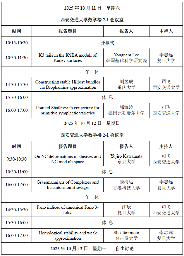 模空间与双有理几何的研究近年来已成为代数几何领域学术研究热点与前沿问题。本次国际会议旨在深入探讨模空间理论与双有理几何的交叉领域,聚焦代数几何分类问题的前沿进展。会议主题涵盖高维模空间的构造与紧化、极小模型纲领(MMP)的新应用、K-稳定性与法诺簇的分类、向量丛与模空间几何的关联,枚举几何与数学物理中的不变量,以及双有理不变量与奇点理论的计算方法。会议将重点关注霍奇理论、导出范畴与模空间理论的融合,以及几何不变量在数学物理中的新启示。
